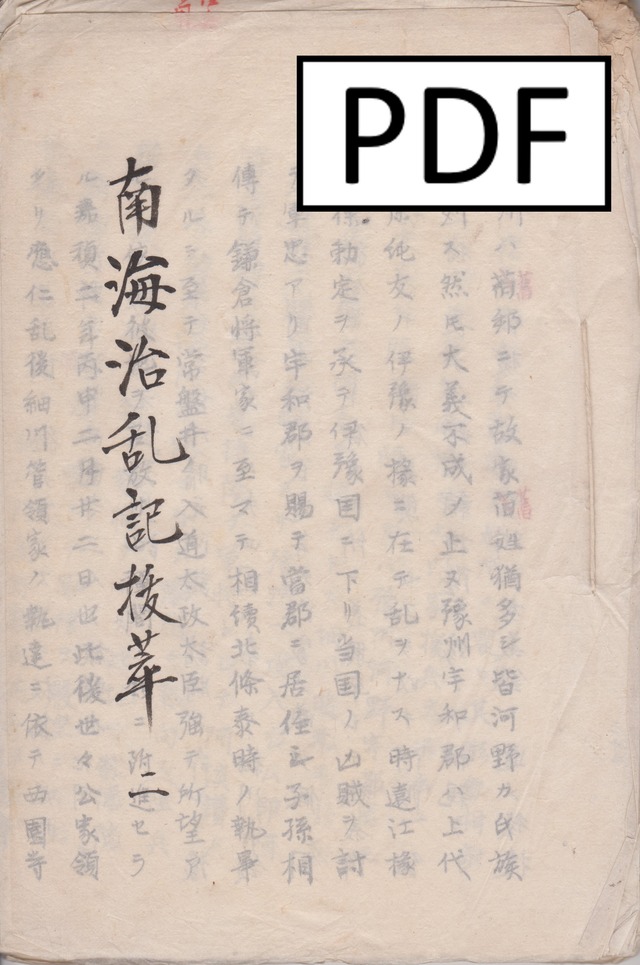 「南海治乱記抜萃 二」 元の本のサイズ 幅約17cm 長さ約25cm 解像度 300dpi 用紙サイズ B5サイズにPDF出力しています。 ページ枚数 96(表紙・裏表紙を入れてます) ※古書のため、スレ、汚れ、虫穴などがあります。 古書が傷まないようにスキャンニングしておりますので、ページに歪みや鮮明にスキャンニングできていない箇所などが生じている場合があります。 ■松山兎月庵文化歴史館所蔵