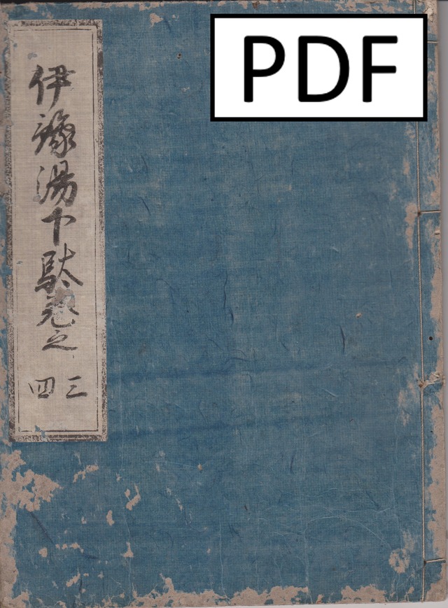 「伊豫湯下駄 巻之三四」 元の本のサイズ 幅約16.6cm 長さ約22.6cm 解像度 300dpi 用紙サイズ B5サイズにPDF出力しています。 ページ枚数 63(表紙・裏表紙を入れてます) ※古書のため、スレ、汚れ、虫穴などがあります。 古書が傷まないようにスキャンニングしておりますので、ページに歪みや鮮明にスキャンニングできていない箇所などが生じている場合があります。 ■松山兎月庵文化歴史館所蔵